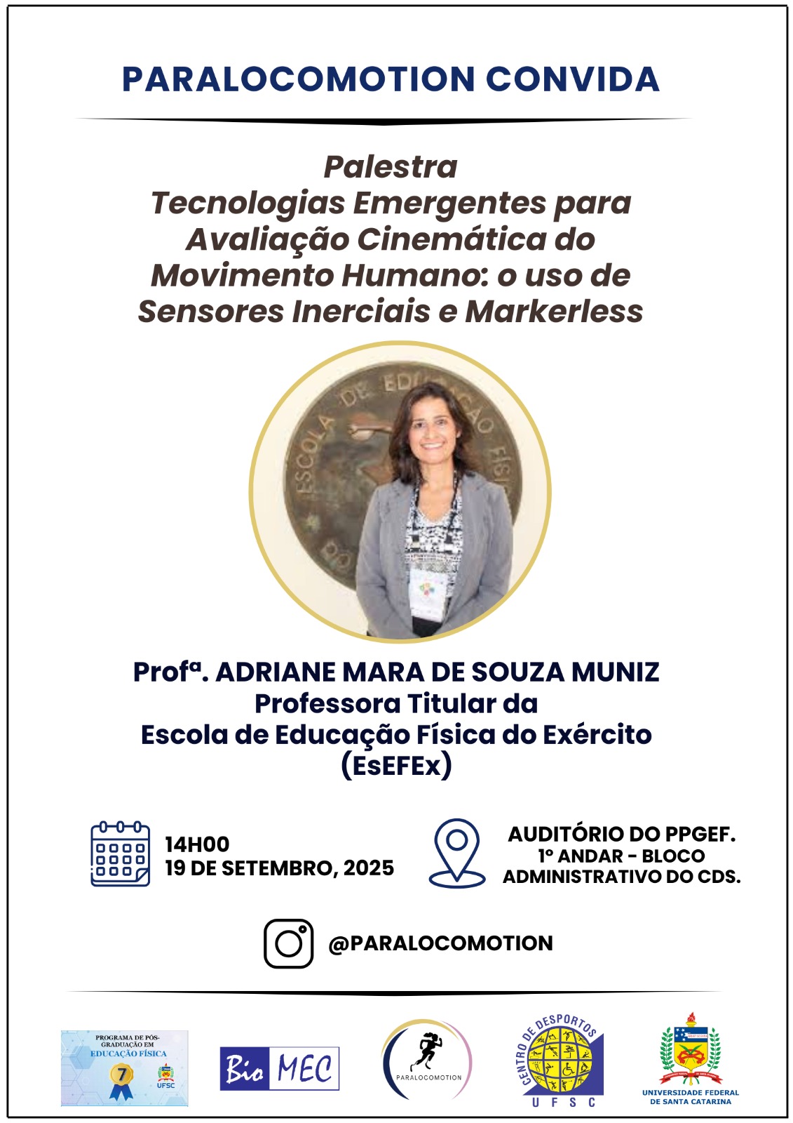 O PARALOCOMOTION convida para a palestra “Tecnologias Emergentes para Avaliação Cinemática do Movimento Humano: o uso de Sensores Inerciais e Markerless”, ministrada pela Profa. Adriane Mara de Souza Muniz, Professora Titular da Escola de Educação Física do Exército (EsEFEx).📅 Data: 19 de setembro de 2025