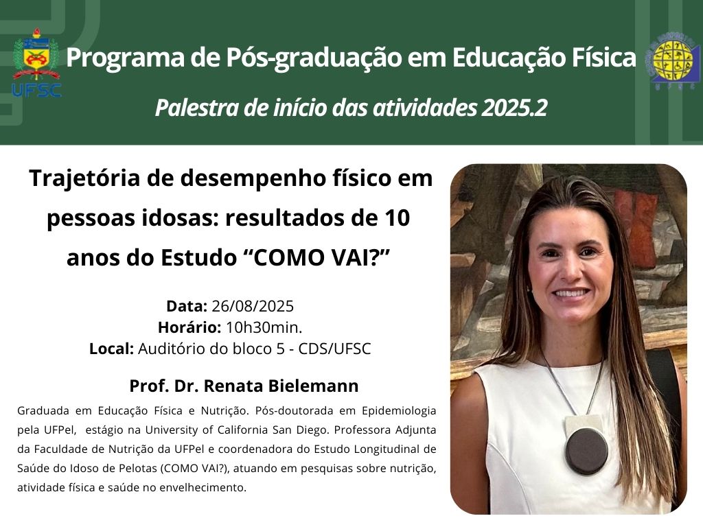 O Programa de Pós-Graduação em Educação Física da UFSC convida docentes, discentes e toda a comunidade acadêmica para a atividade de início do período 2025.2 do PPGEF/UFSC, que contará com a palestra: